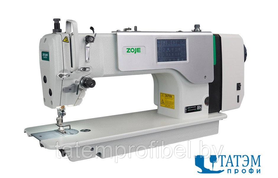 Одноигольная, прямострочная промышленная швейная машина челночного стежка, с нижним продвижением ткани, со встроенным в корпус сервомотором и блоком управления с сенсорным экраном, с увеличенным вылетом рукава длина 300 мм высота 120 мм, который позволяет шить крупногабаритные изделия, системой смазки: замкнутый «сухой» контур, с автоматическими функциями: позиции иглы, закрепки, подъема лапки, и обрезки ниток (до 3 мм), для шитья легких и средних материалов. Подходит для шитья деликатных тканей, так как замкнутая, «сухая» система смазки исключает попадание масла на ткань.